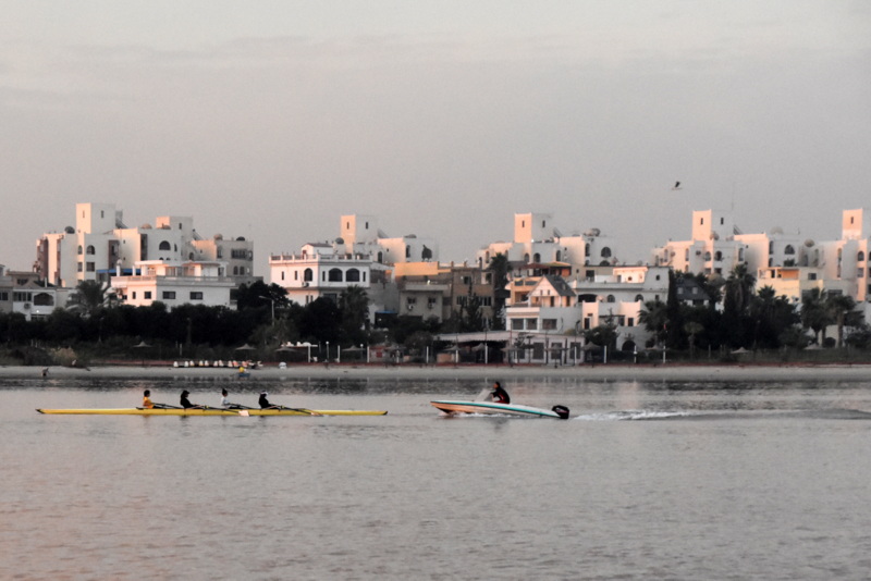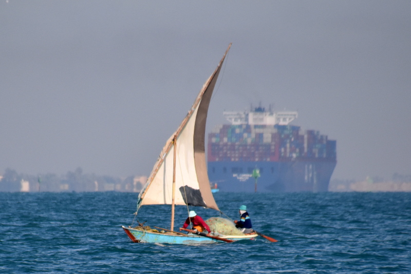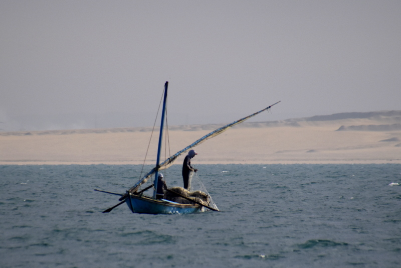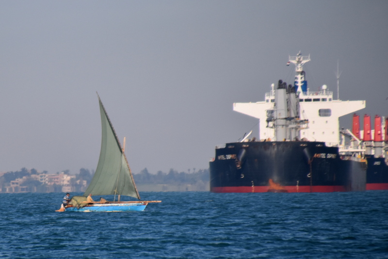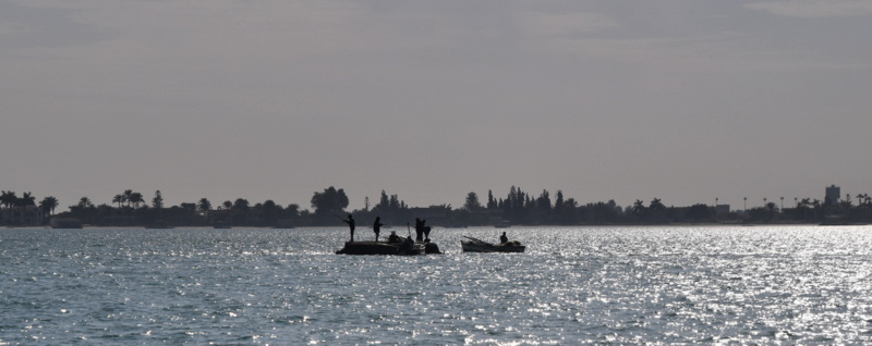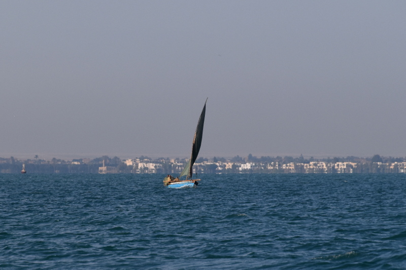 Tokrat plujemo preko obeh Grenkih jezer, velikega in majhnega. Če smo včeraj srečevali ribiče na majhnih lesenih čolničih, ki so veslali po kanalu, lovili ribe in cikcakalil (dobesedno!) nekaj metrov od več sto metrskih grdosij, so na jezeru čolniči na vetrni pogon. Kot na Madagaskarju. Jadrajo in lovijo ribe. Le zakaj mi ne smemo jadrati? Pa se ustavimo ob enem takem čolniču z ribičih. Poskušamo ujeti ribe na šuškovce. Pa fantje hočejo toliko denarja, da se riba niti približno ne ujame. Za surovo ribo sredi vode (brez dostave, torej) so hoteli imeti šestkrat toliko, kot smo plačali za očiščeno, filirano, pečeno in postreženo v dobri (za te razmere, jasno) gostilni v Port Saidu. Saj, tudi če bi ribiči postavili gostilniško ceno, bi jo prodali, tole je pa bilo res že malček neokusno.