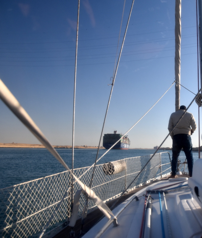 Že včeraj sem pogledal, kakšni plimni tokovi nas čakajo. Načeloma bi nam morali biti večji del poti v prid. Ampak. Več kot polovico časa teče morje v jezero in nas ustavlja z dvema vozloma protitoka. Šele tik pred Port Suezom imamo slack, toka v našo smer pa nismo dočakali.