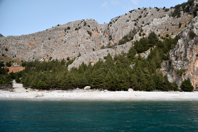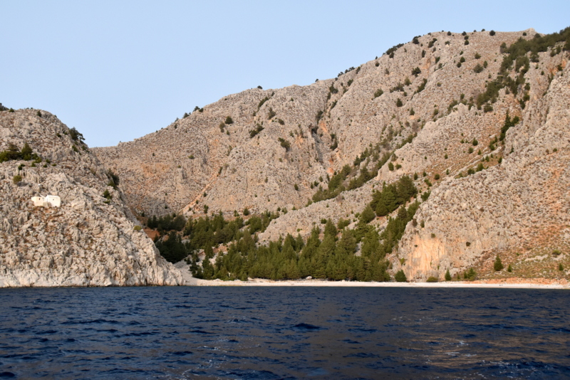 Nekaj zalivov na Simiju, ki bi bili potencialno zanimivi, sem si pogledal na guglovih mapah. Le globin ne poznam. Barve sicer povedo vse, je pa potrebno vedeti, kakšna je prosojnost morja. Tega pa za Simi ne vem. Zato greva kar po vrsti. Pa se izkaže, da prvi zaliv ni primeren za sidranje. Trideset ali štirideset metrov od obale je globina še vedno 12 m. Ko sem tako prilagodil barvno skalo s fotografije na globino, je hitro postalo jasno, da tudi večina drugih ne bo. Ostal nama je največji, ki pa je precej odprt na zahod.