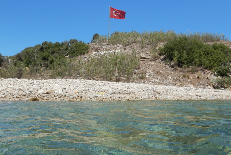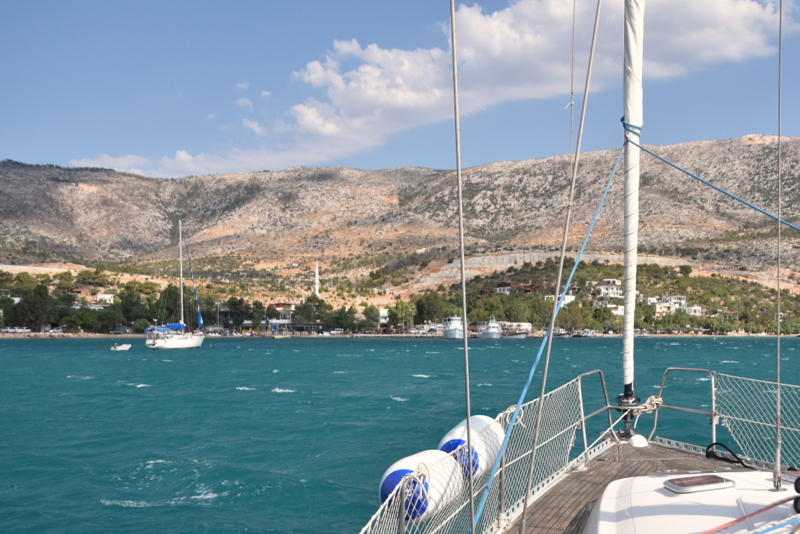 Ponoči je bilo napovedano brezvetrje. Na vseh vremenskih modelih. Le Rod v svoji Bibliji piše, da je tukaj jeseni lahko kažin v obliki 8-9 Bf padajočega vetra s Taurosa. Nocoj še ni jesen in verjetno je bilo zato samo 6-7 Bf konstantno, v sunkih 8 Bf. Malo je večkrat položilo tako močno, da so se v kuhinji odpirali nezaklenjeni predali. Ker je bilo napovedano 0-1 Bf, sem se sidral le za 6 Bf. Ko se je veter obrnil iz rahlega južnega na močan severni, naju je prestavilo za deset metrov in potem se je sidro vkopalo. Vkopalo! Komaj sva ga ob odhodu potegnila iz lepljivega blata. Tukaj to ni nobena težava, med barkami je sto metrov. Če bi se pa kaj podobnega zgodilo kje v gužvastem zalivu, bi bil pa kažin. Večja poljska dvojambornica s turško posadko se je pa vseeno morala presidrat.