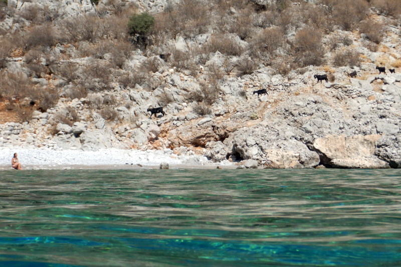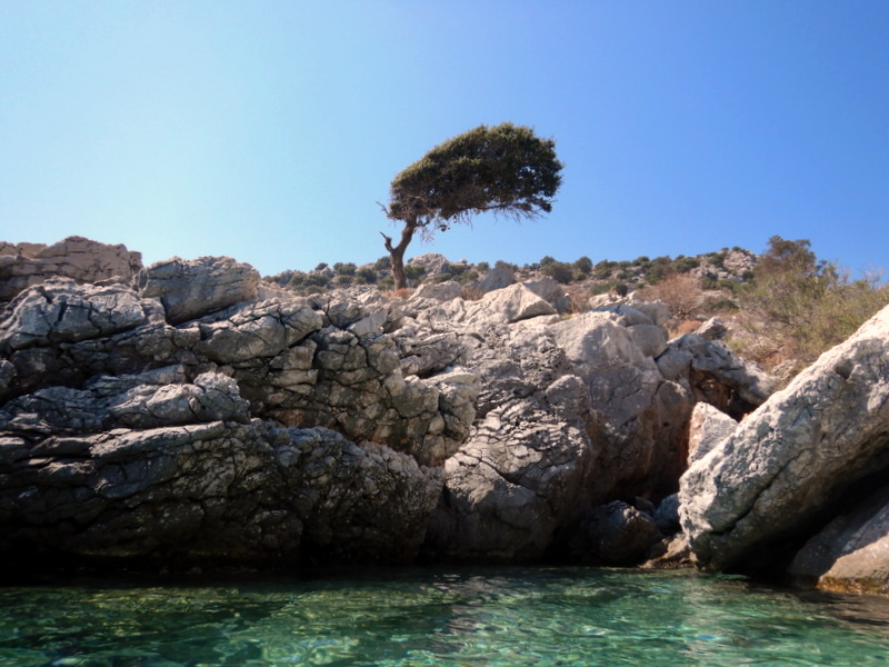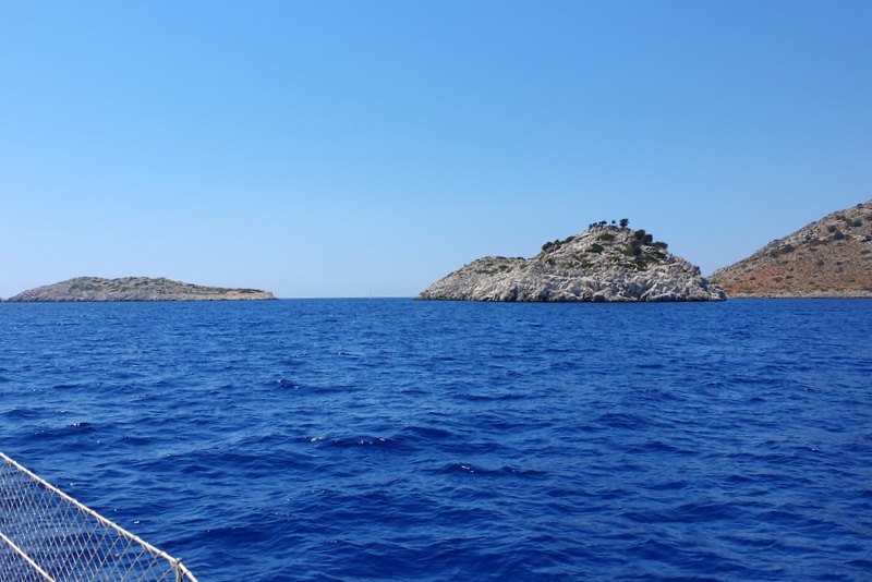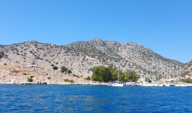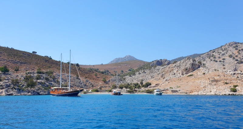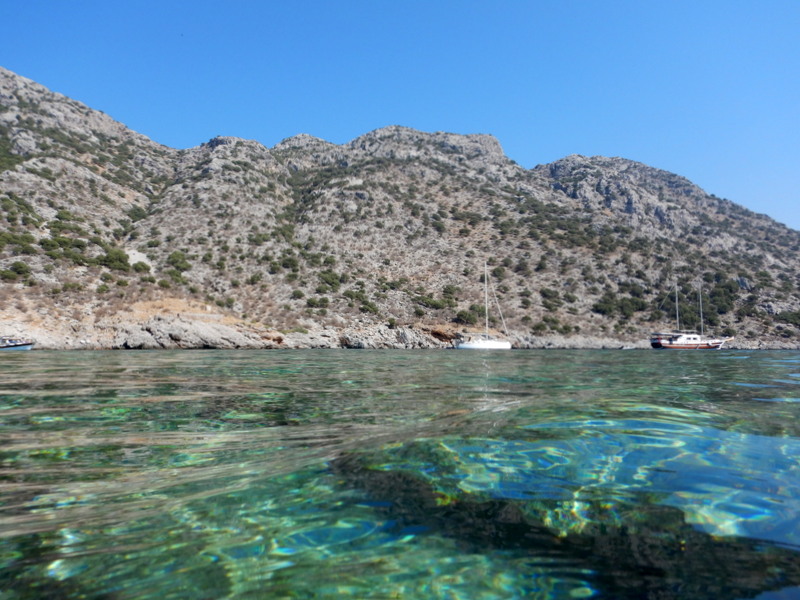 Ob sedmih se odsidramo, ob desetih zasidramo. Za plavanje. Ustavimo se za otočkom Arap adasi, v kristalno čisti vodi, skoraj tako prozorni, kot je bila na Antikithiri. Na enem koncu so izviri hladne sladke vode in voda v celotnem zalivu je malo hladnejša, kot smo jo bili navajeni do sedaj. Namerimo 27-28 stopinj. Z Janom plavava, Vesna gre v snorklarijo in po eni uri v to raboto premami še Jana.