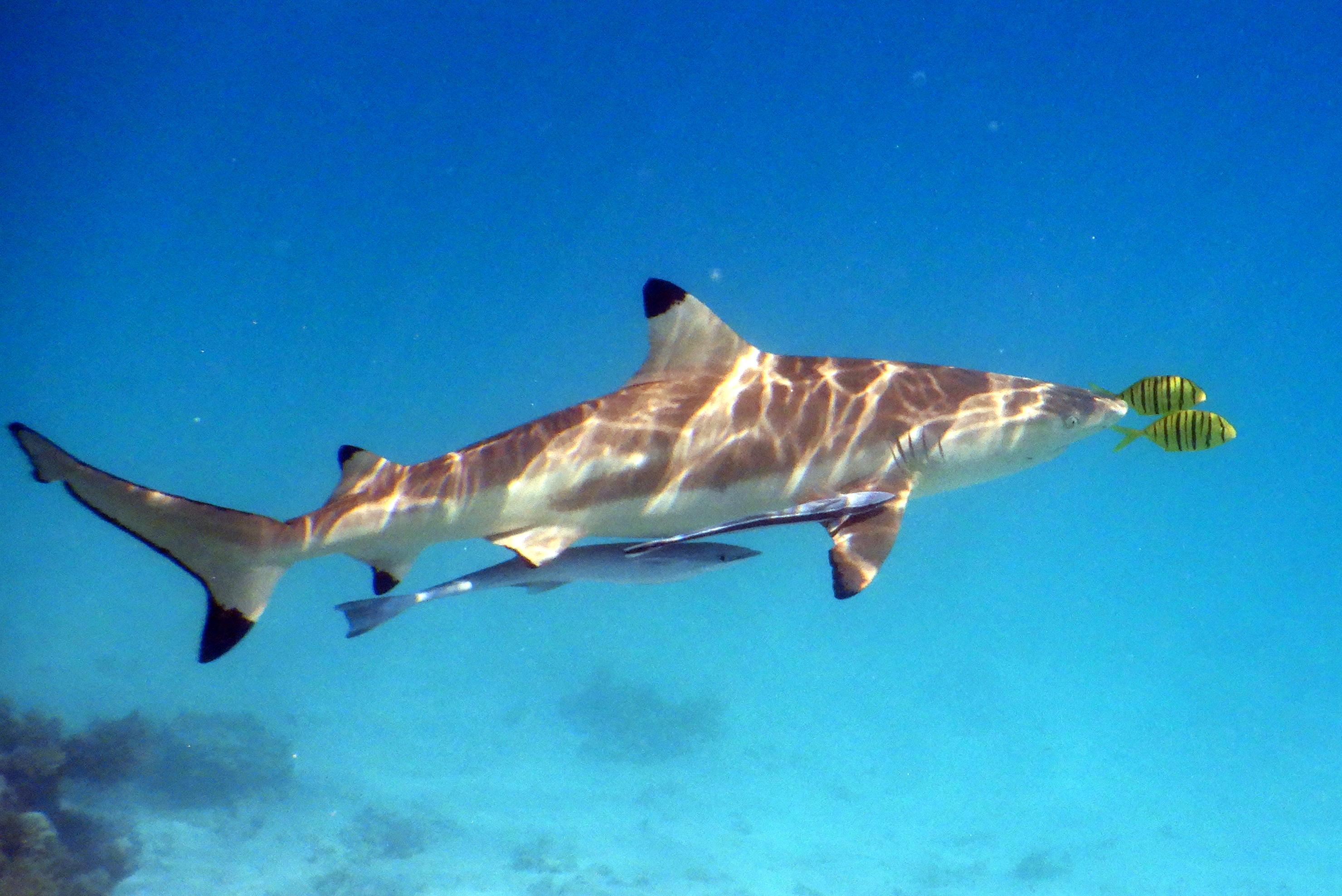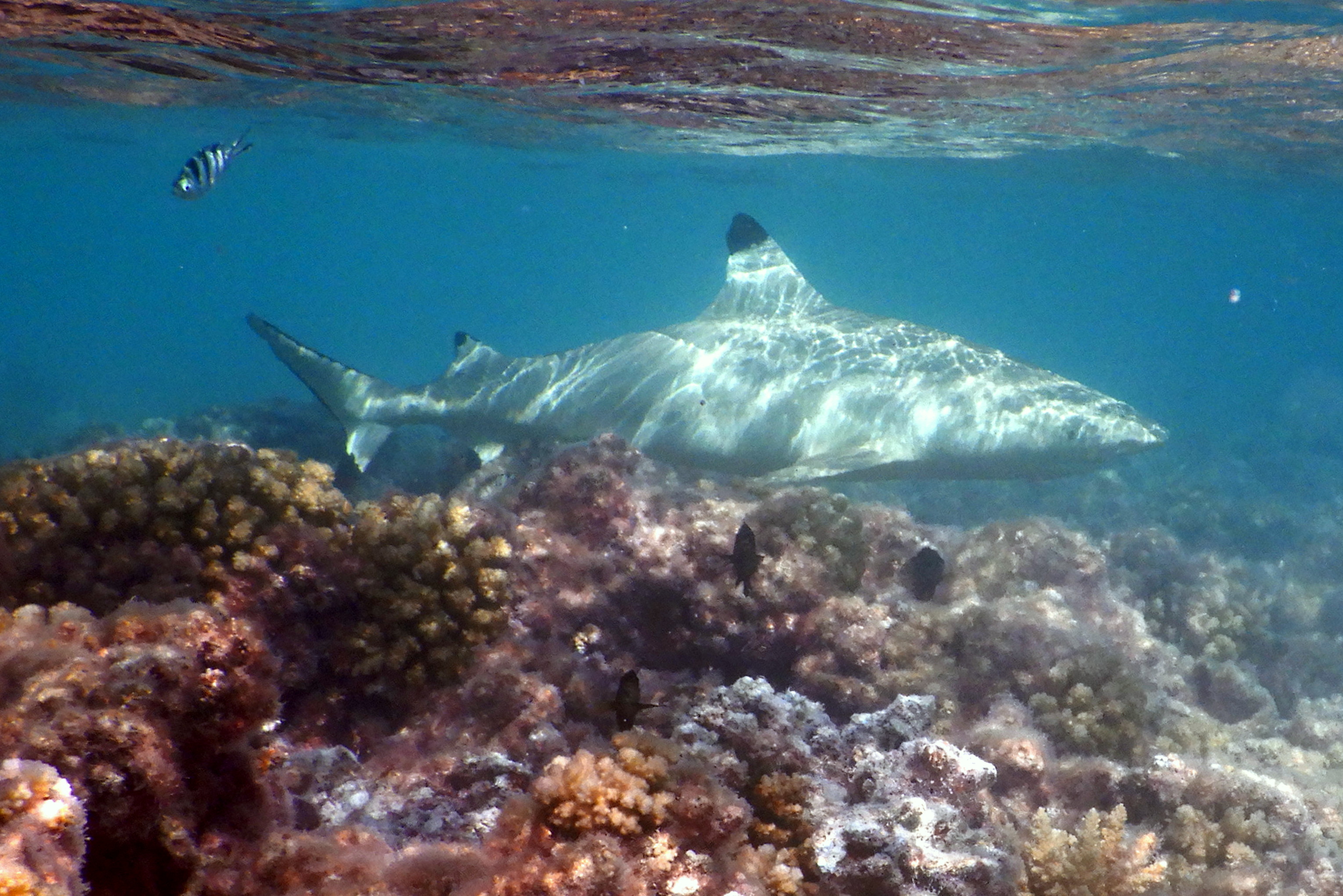 Morski psi še kar plavajo okoli barke. Res jih je veliko. Že kar čudno je, če ni nikjer nobenega, pogosto jih je več hkrati. Vesna je med snorklarijo enega celo podila pred sabo, pa je kmalu ugotovila, da je boljši plavalec od nje.