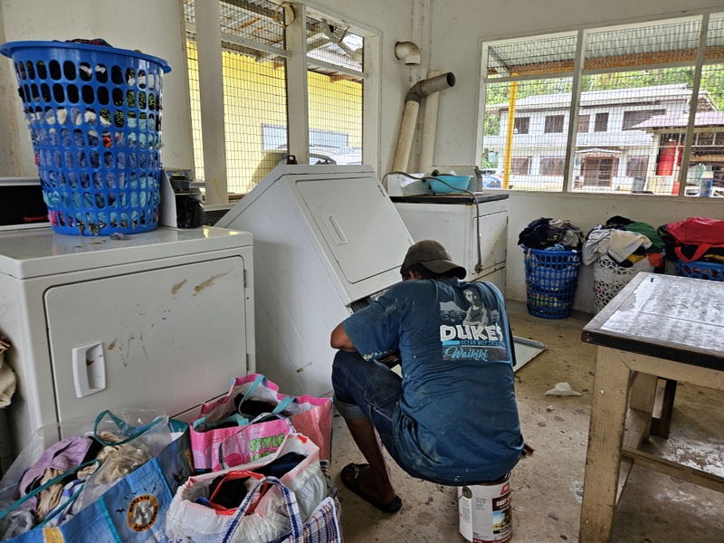 Dežuje. No, večino časa ne dežuje, ko pa se ulije, se ulije zares. V eni izmed pavz oddingirava v pralnico. Gužva je, takoj nama je jasno, da bo to celodnevni projekt. Pa še sušilec ne dela. Preko dneva ga nekako popravijo, pa se spet pokvari. Pozno popoldne šele je žehta končana.