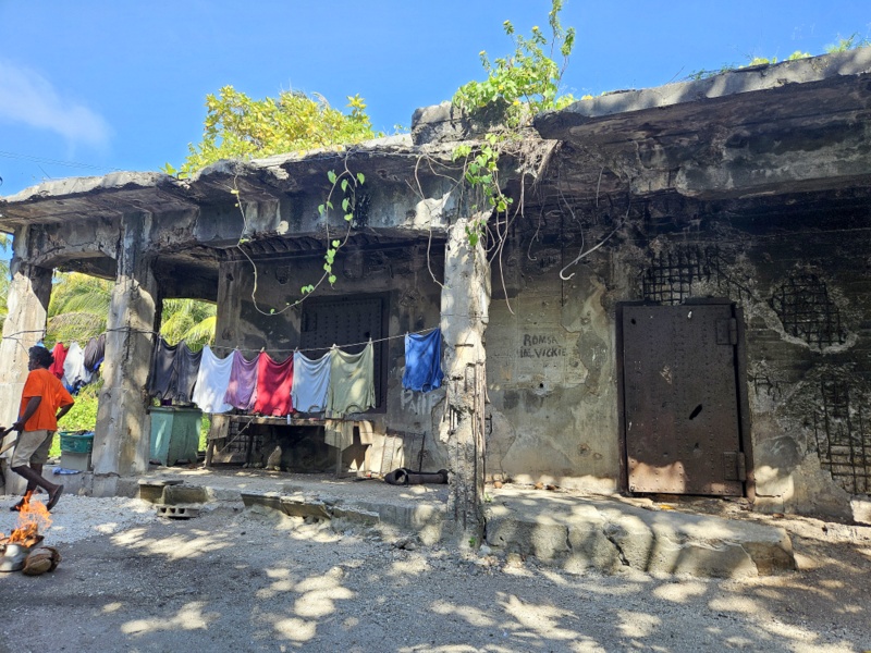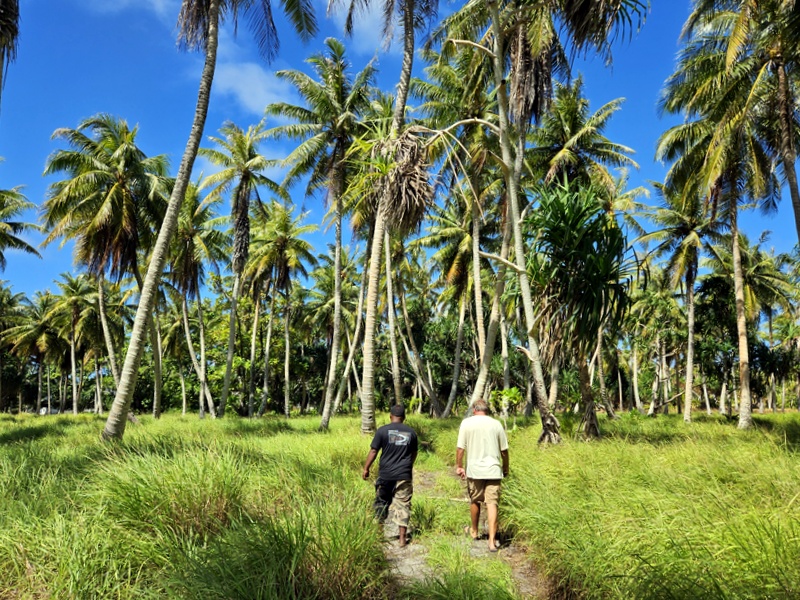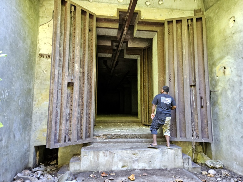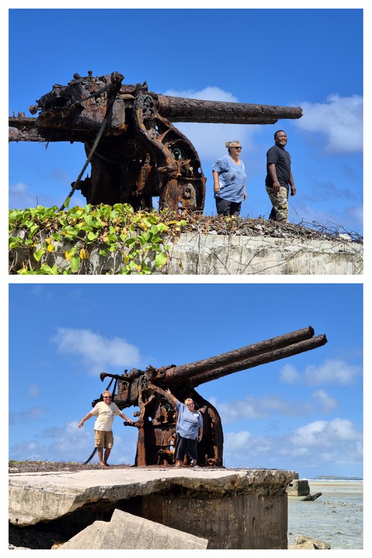 Pustila sva skrbi na barki in se odpeljala na turo po otoku. Policaj Ari naju je peljal na nekajurni sprehod po vročem soncu in le delno v senci kokosovih palm. Še palmam je vroče, kaj šele nam. Ena je od izčrpanosti spustila oreh sumljivo blizu. Nas je ciljala ali ga le ni mogla več zadrževati? Ogledali smo si japonske bunkerje in topove iz druge svetovne vojne. V osemdesetih letih jih je že močno prerasel gozd (kar jih ne stoji na s soljo razkuženem koralnem grebenu). Počutim se kot Indiana Jones, ko se sprehajam po skladišču, kjer so še vedno vreče s cementom. Po 80 letih cement nekako ni več uporaben, ampak nihče ga ni ves ta čas odstranil.