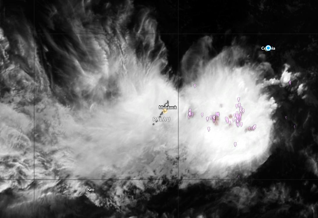 Tole, z bojo na 25 m globine in stran od čeri ter otokov sva dobro naredila. Veter se je vrtel ponoči in se je vrtel še cel dan. Večinoma ga pravzaprav niti ni bilo, vsaka nevihtica pa je prinesla nekaj deset minutne sunke iz druge smeri. Nevihtic je bilo kar nekaj. Dvoje nevihtnih jeder je že od včeraj v okolici, eno je dokaj blizu na vzhodu. V središču je cilkon z vetrovi v krogu. Drugo je na celotnem delu med Palavom in Filipini. Pogled na satelitsko sliko pokaže goste težke oblake in množico strel. Tudi v naravi slišiva nekaj strel. Torej so precej bliže, kot tiste na sliki, ki so od naju oddaljene dobrih petdeset milj. Strel do sedaj praktično nisva doživela že od Paname sem.