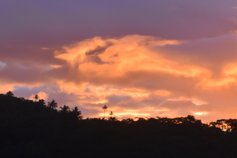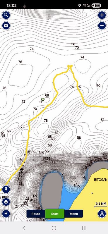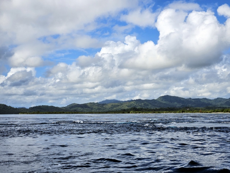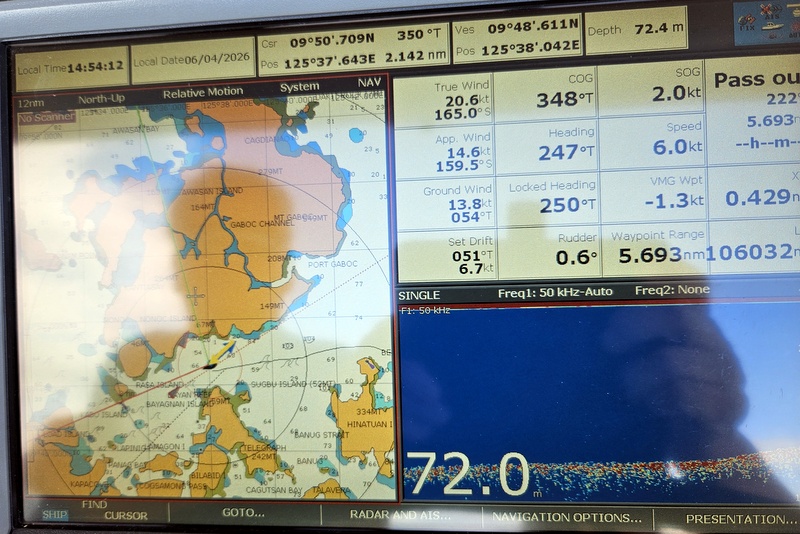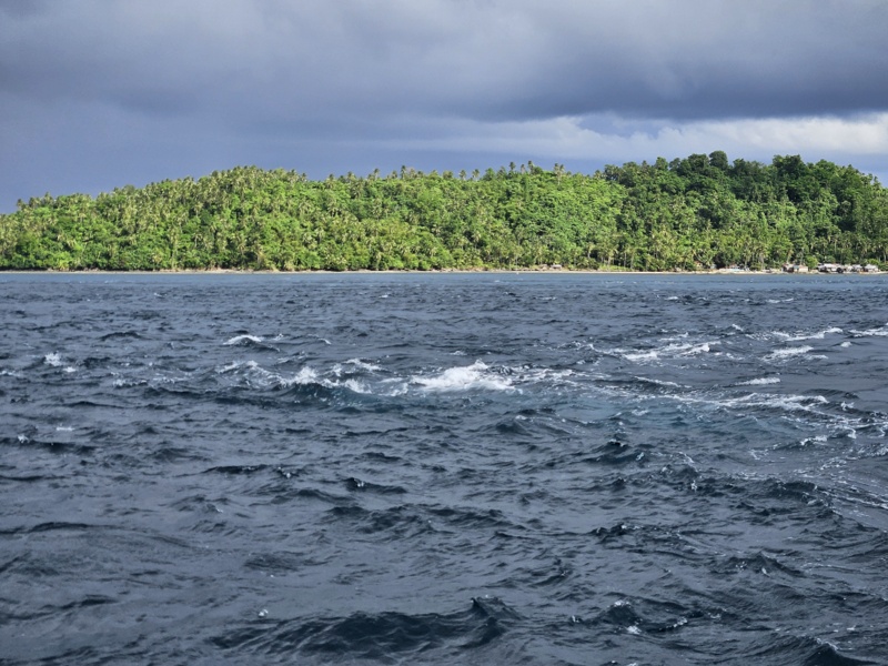 Danes nama je dalo morje tinto pit! Lepa noč, lepo jutro, lep veter. Odsidrava se in odjadrava kot ta-velika. Po dveh urah vetra med otoki po pričakovanju zmanjka in se spet povrne čez nekaj ur, ko sva na odprtem. Spet lepo jadrava. Danec Sorel iz North Albatrosa, ki je tukaj plul včeraj, nama je javil, da je okoli otoka Bayagnan "up to 6 knots of E going current". Po mojih izkušnjah je potem pol tega. In ker sva spet lepo in hitro jadrala proti otoku, opozorila nisem jemal resno. Bova že nekako, tako kot sva vedno v prehodih v atole.