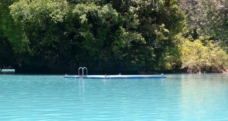 Potem sledi izlet z dingijem. Še z najinim majhnim čolničkom sva enkrat udarila v nekaj. V tem mleku se ni videlo v kaj. Mogoče je bil pa krokodil. Čeprav dvomim. Palavški krokodili se imenujejo saltwater crocodiles in ne milk crocks. Bila sva (skoraj) sama, očitno pa sem vozijo turiste kot po tekočem traku. V najbolj zaprtem delu, ki je hkrati tudi najbolj mlečen, sta bili sidrani dve plavalni ploščadi. Kakorkoli, ko se zapeljeva na drugi konec zaprtega zaliva, je vidljivost v vodo boljša in Vesna naredi nekaj podvodnih fotk kar z dingija.